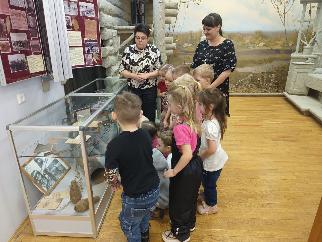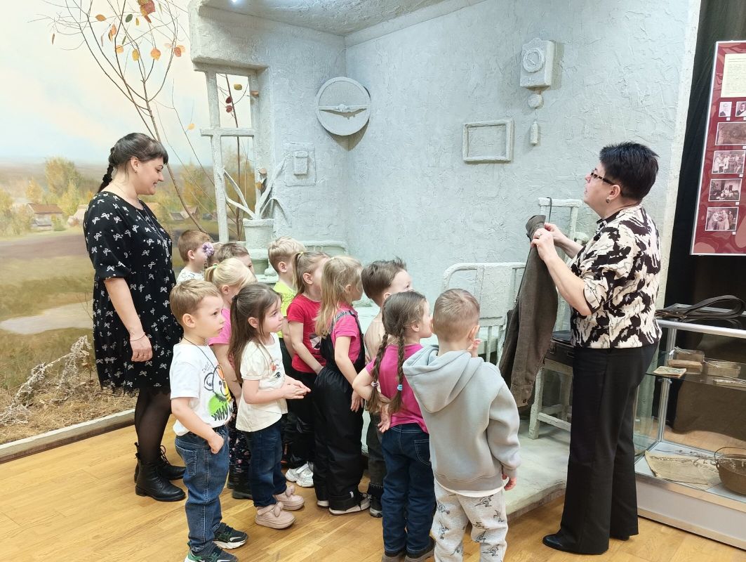 Во время экскурсии дети активно участвовали в беседе. Слушали рассказ экскурсовода, который рассказал им о предметах, используемых во время войны: посуде, одежде, обуви и музыкальных инструментах. Первое знакомство с музеем состоялось – ребята остались под большим впечатлением.