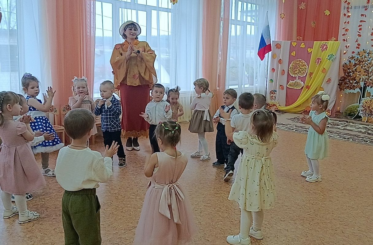На праздник к ребяткам “заглянула” красавица Осень. Вместе с малышами веселились, играли, пели песни про дождик и танцевали.