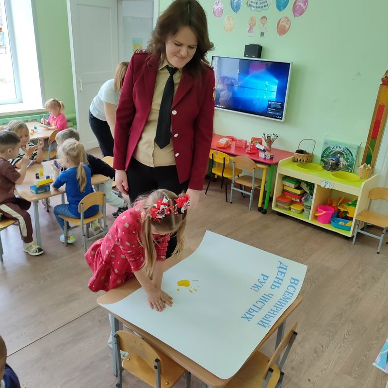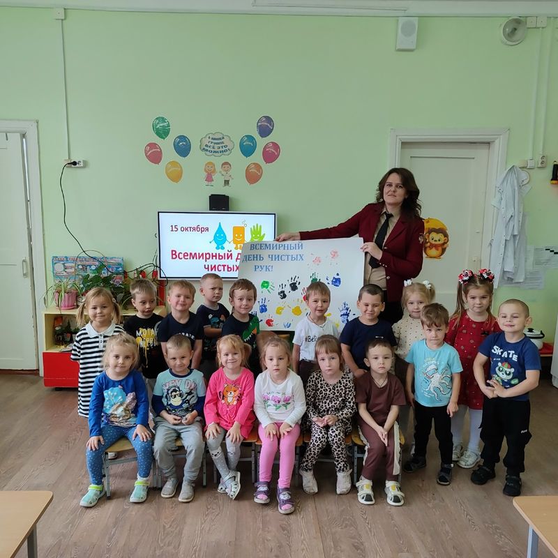 В этот день к нам в гости пришла ведущий специалист-эксперт территориального отдела Управления Федеральной службы по надзору в сфере защиты прав потребителей и благополучия человека А. Пивоварова, провела познавательную беседу о микробах-о том какие они бывают, где живут и как могут навредить организму. Ребята с интересом слушали рассказ о невидимых глазу существах которые подстерегают нас повсюду, и о том как важно с ними бороться. Также выяснили, зачем и когда мыть руки, как это делать и почему необходимо использовать мыло. Далее дети отгадывали загадки, смотрели мультик «Иммунтик-чистые руки», рисовали микробы. В заключении дети оставили цветные отпечатки ладошек на плакате «Всемирный день чистых рук».