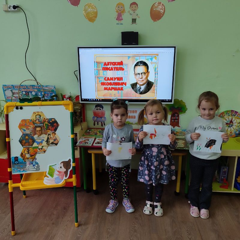 В средней группе для ознакомления детей с творчеством Маршака были выбраны следующие произведения: «Усатый-полосатый», «Курочка Ряба и десять маленьких утят», «Сказка о глупом мышонке», «Сказка об умном мышонке». Самым интересным этапом стала творческая работа. Детям была предложена задача нарисовать образ кота из произведения «Усатый-полосатый». Многие ребята проявили фантазию и креативность, создавая яркие и оригинальные образы животных. Завершающим аккордом стал показ выставки детских книжек с произведениями Маршака.