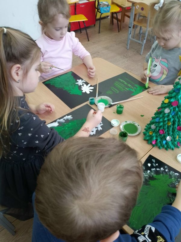 В группе ребята украсили искусственную елочку в группе. Провели беседу по экологии «Сохраним елочки», посвященную проблеме сохранения живых елей, на которых дети узнали, какое значение имеют ели для животных и людей, для всей природы в целом. Ребята нетрадиционным способом нарисовали елочку-красавицу.